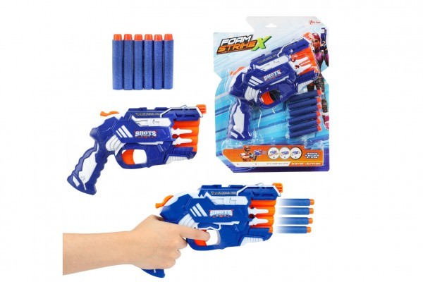 Hravá zábava nejen pro kluky! Pistole na pěnové náboje zabaví každého malého pistolníka. Náboje umístěte do komor pistole a natáhněte kohoutek. Teď už stačí jen dobře zamířit a vystřelit na jakýkoli cíl a to všechny čtyři náboje najednou. Velikost pistole je 25 cm.