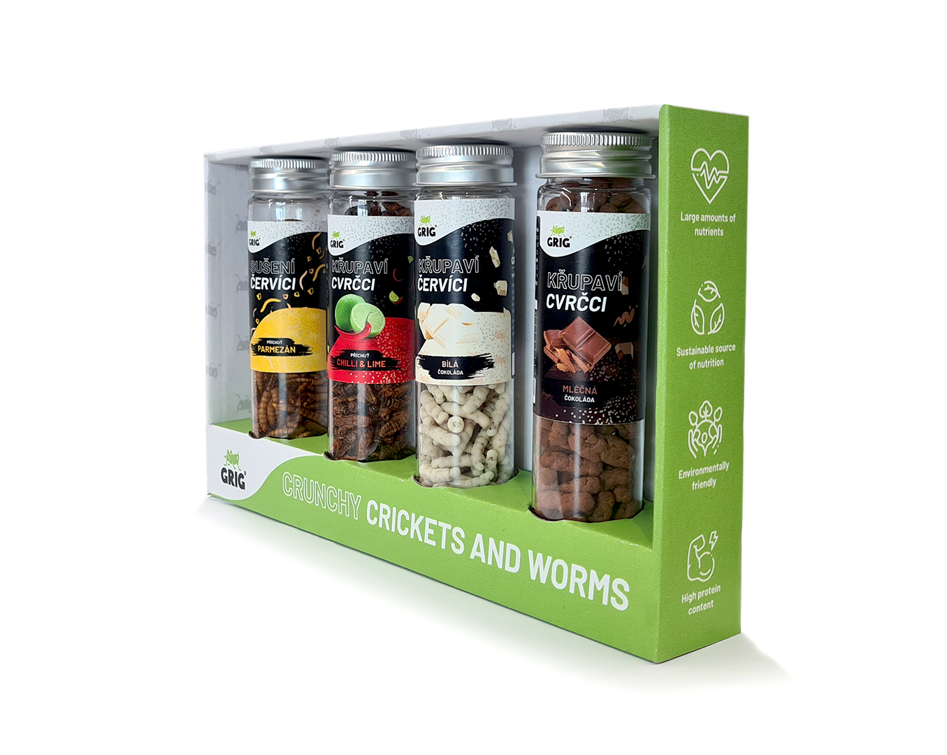 Dárkové balení zkumavek s jedlým hmyzem je neotřelý a originální dárek pro dobrodruhy a milovníky nevšedních chuťových zážitků. Tato sada obsahuje několik zkumavek, každá naplněná různými druhy sušeného jedlého hmyzu, jako jsou cvrčci Chilli & Lime, Sušení červíci Parmezán, nebo hmyz v bílé a mléčné čokoládě.