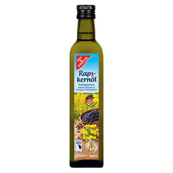 GG Panenský řepkový olej - lisovaný za studena - 500 mlŘepkový olej je vysoce kvalitní olej, který se mechanicky vyrábí jemným lisováním za studena. Má jemnou, oříškovou chuť a lze jej použít mnoha způsoby, hodí se jak na studená tak teplá jídla. Díky vysokému obsahu přírodního vitaminu E a bohatému obsahu omega-3 mastných kyselin může být řepkový olej důležitou součástí vyvážené a pestré stravy.Vyrobeno v Německu.