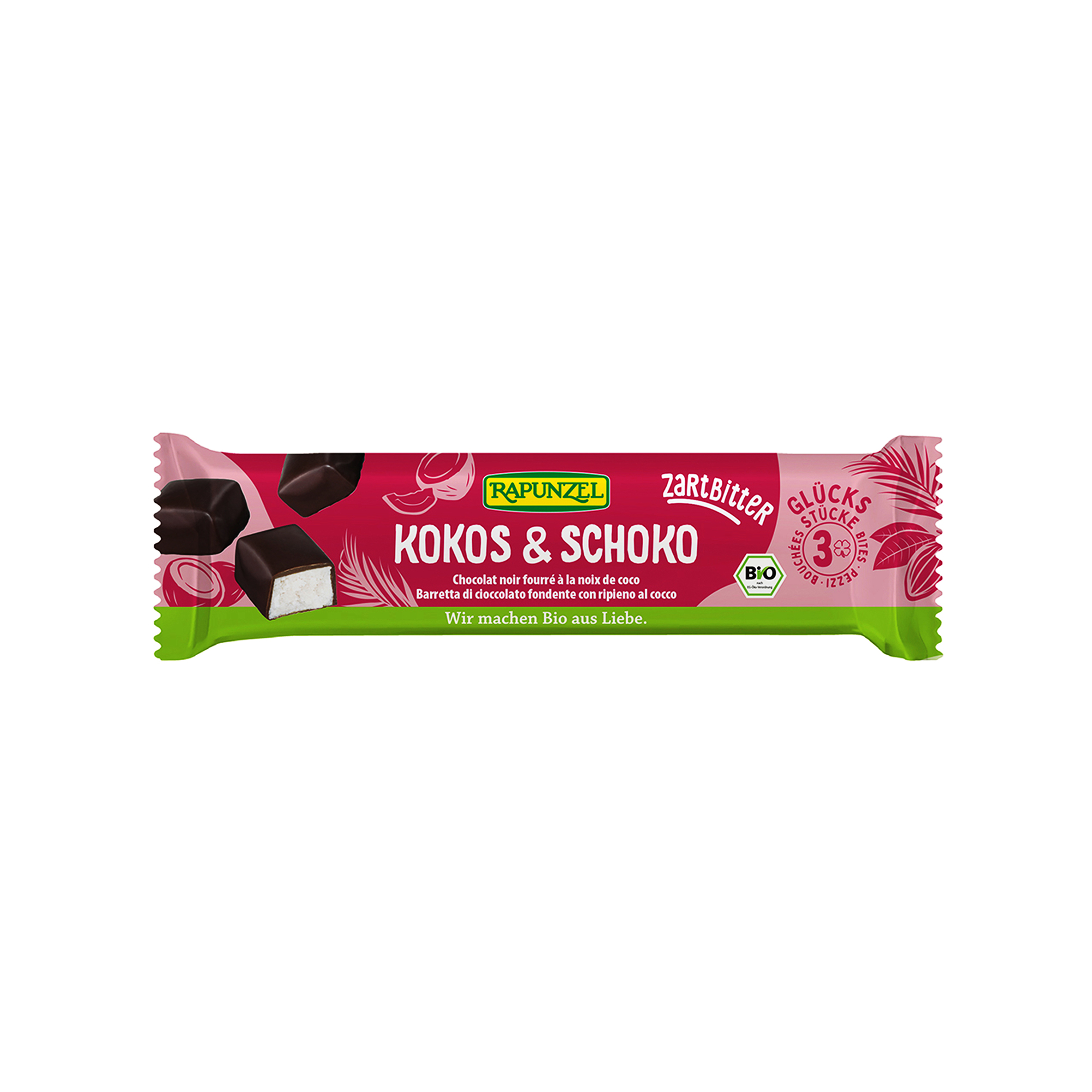 Kokos 36 %, hořká čokoláda 25 % (třtinový cukr, kakaová hmota, kakaové máslo, kakaová sušina 55 %), rýžový sirup, agávový sirup, sušený rýžový sirup, rýžová mouka. Může obsahovat stopy lepku, mléka, skořápkových plodů, sezamu a sóji. produkt kontrolovaného ekologického zemědělství.Kalorická...