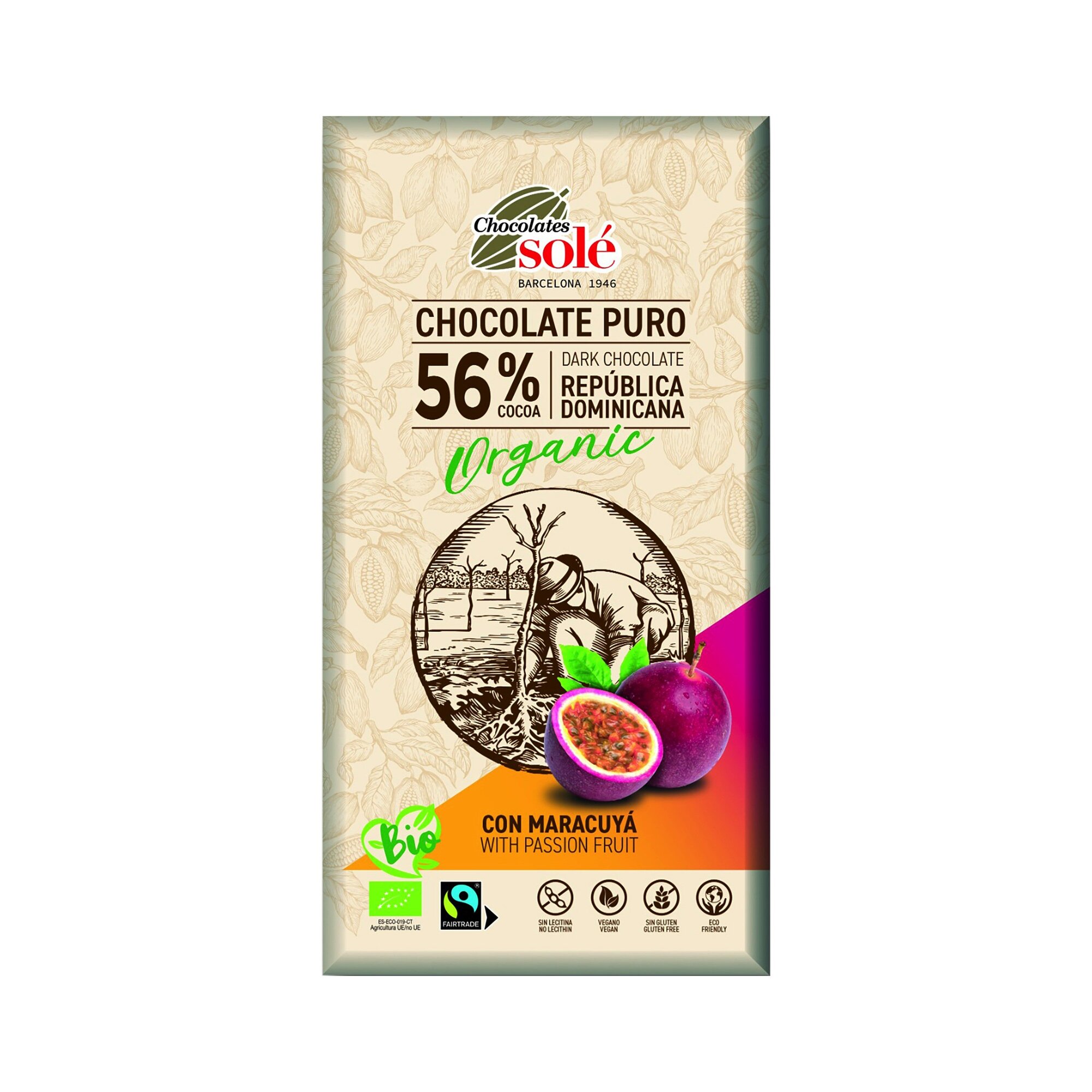 Kakaová hmota, přírodní třtinový cukr, kakaové máslo, marakuja 6 %. Obsah kakaové sušiny nejméně 56 %. Může obsahovat stopy SKOŘÁPKOVÝCH PLODŮ a MLÉKA.*produkt kontrolovaného ekologického zemědělství
