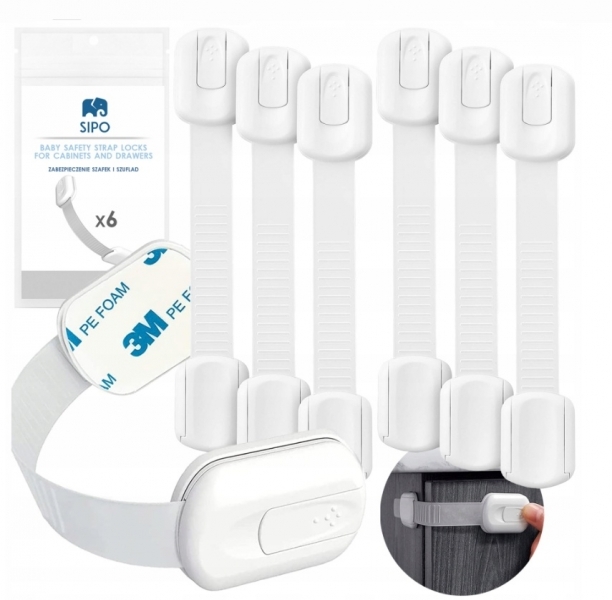 Bezpečnostní páskové zámky.SIPO sada 6 kusů univerzálních bezpečnostních prvků pro skříně, zásuvky se snadnou funkcí zámku, která zajistí rychlý přístup dospělým ale ochrání před otevřením malými dětmi.Bezpečnostní prvky pro skříně a zásuvky jsou praktickým zařízením, které zajišťuje bezpečnost...