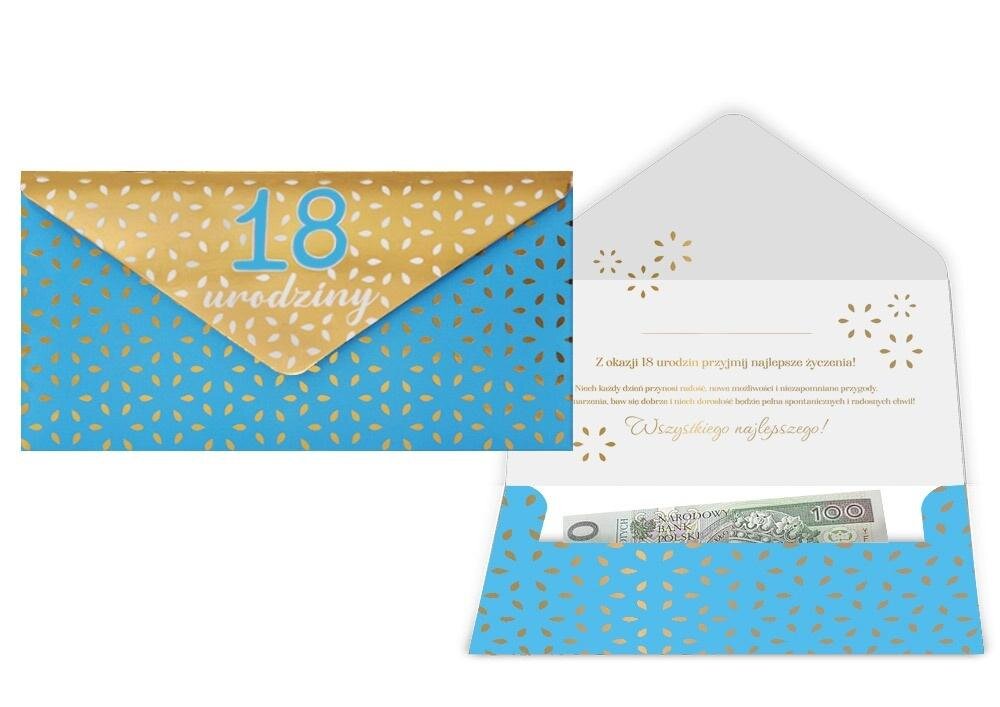 Koperta podarunkowa KOP-023 "18 urodziny" Koperta podarunkowa jest eleganckim sposobem na podarowanie bliskiej osobie banknotu lub karty podarunkowej. Koperta jest kolorowa i uszlachetniona metalizowaną folią hot-stamp, jest solidnie wykonana i wyposażona w rzep, co umożliwia jej wielokrotne...