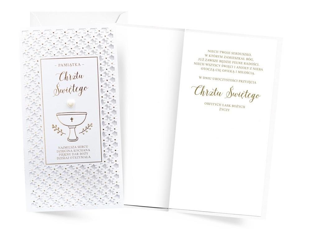 Kartka na Chrzest z serii Passion Moments PM-399 Każda kartka w kolekcji Passion Moments to małe arcydzieło - wyjątkowe i niepowtarzalne, piękne wizualnie. Kartki PM są bardzo bogato zdobione, a jednocześnie skromne i stylowe, cały efekt tkwi w detalach i doskonałym wykonaniu. W zależności od...