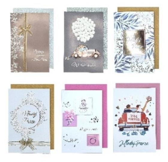 Miks wzorów, towar wysyłany losowo. Cena za sztukę.Kartka ślubna składana. Nadruk z brokatem, hot stamp i elementami 3D. Wymiary: 11,5 x 17 cm. prečítať celé