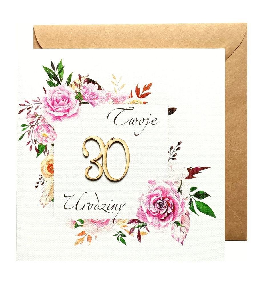 Kartka okolicznościowa z okazji urodzin o treści: Z okazji Twoich 30 urodzin życzę Ci: Aby jedynymi łzami, które pojawią się w twych oczach,Były kryształowe łzy szczęścia Aby radosnego uśmiechu na twej twarzy, Nie zakryły ciężkie chmury smutku Aby płatki róż wyścielały drogę twego przeznaczenia A...