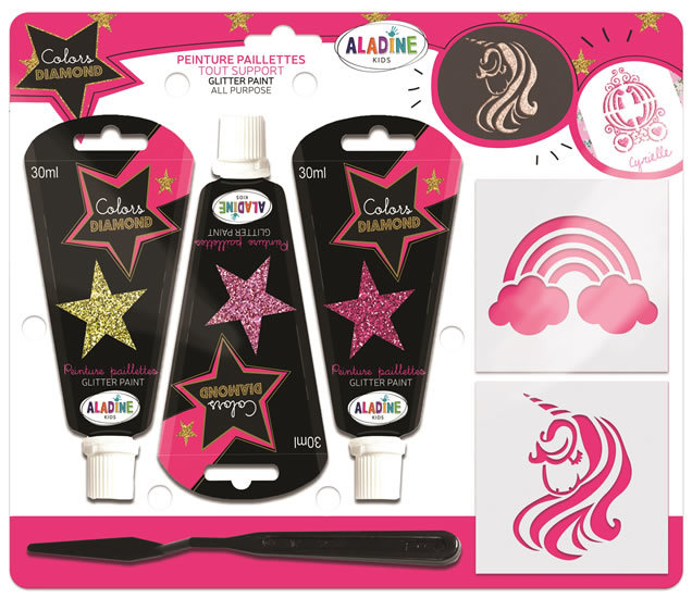 Kreativní sada s diamantovými barvami. Vyjímečně třpytivé barvy se nanáší špachtlí přes šablonu. Jsou vhodné na papír, textil, kov, i plast: jsou ideální k dekoraci přáníček, deníků, triček, tenisek, kšiltovek, ale i penálků a dalších předmětů. Sada obsahuje 3 ks barev, 2 šablony a špachtli.