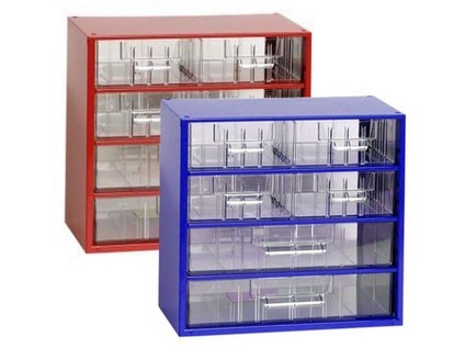 rozměry (Š x V): 30,5 x 28 cmzásuvky: 4 střední, 2 velkémateriál: kov, plastbarva: červená, modrá Kovová ukládací skříňka s plastovými zásuvkami 2 velikostí je vhodná pro přehledné skladování drobných předmětů a součástek. prečítať celé