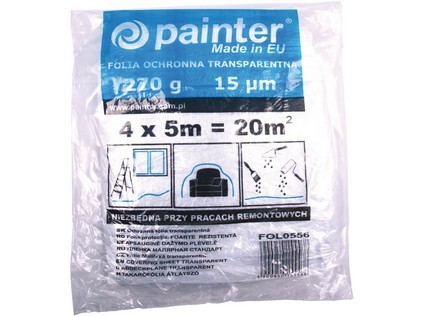 Zakrývací fólie 4 x 5 m, 15 µm.transparentní ochranná fóliepokryje plochu 20 m2hmotnost fólie 270 gpro ochranu nábytku, oken nebo podlah při malování místnostíZakrývací malířská fólie, která ochrání Váš nábytek, okna nebo podlahy před zašpiněním a pokapáním barvou v průběhu malování.rozměry: 4 x...