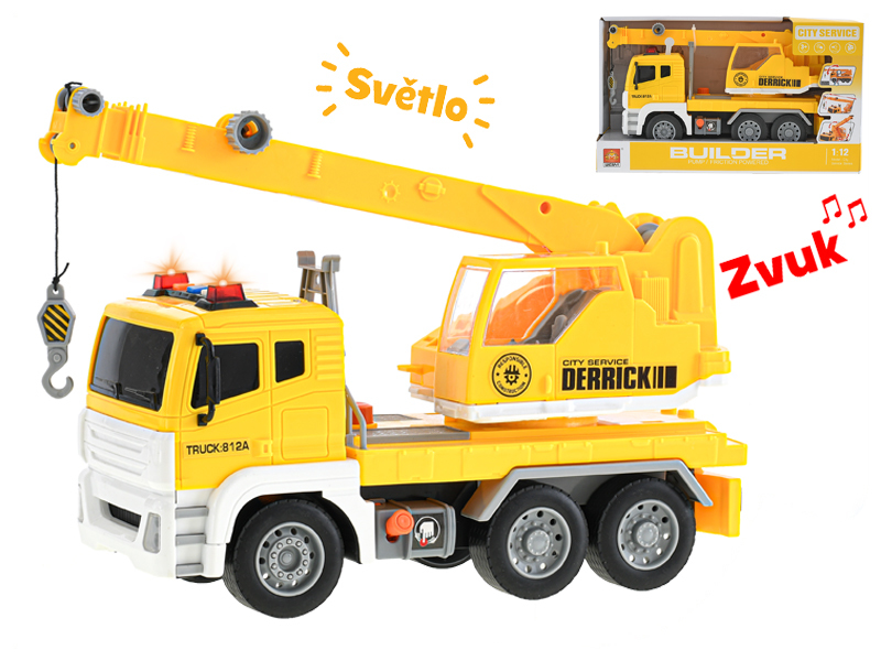 Auto jeřáb 28cm 1:12 pohyblivé části na setrvačník na baterie se světlem a zvukem v krabičce