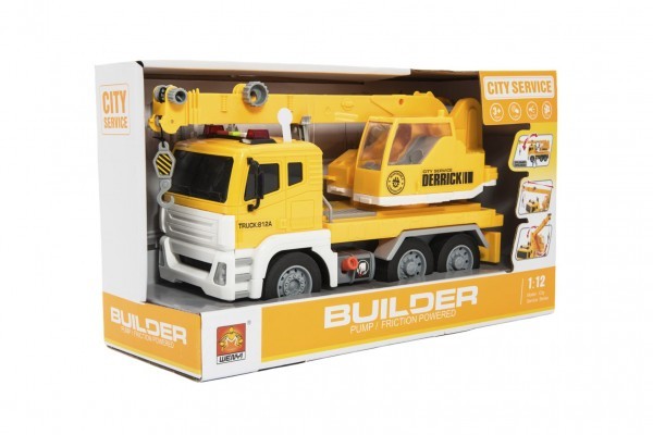 Stavební stroj jeřáb 30cm plast na setrvačník na baterie se světlem se zvukem v krabici 36x21x14cm