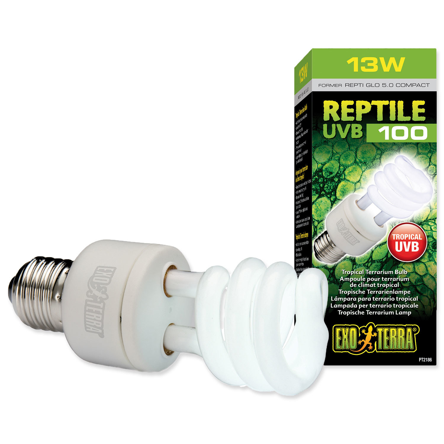Žárovka Exo Terra Reptile UVB100 vydává optimální úrovně UVB, podobně jako ve stinných prostředích deštných pralesů a dalších tropických lokalitách. Plazi žijící v těchto stanovištích obdrží mírné UV záření v důsledku klimatických podmínek (poměrně vysoká vlhkost, změny počasí, atd.).