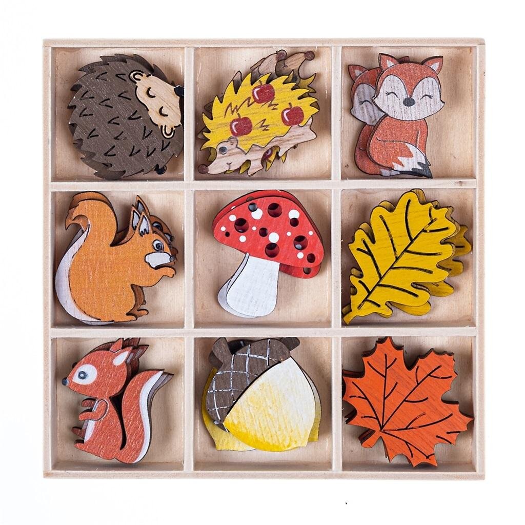Kształty z drewna o leśnej tematyce utrzymane w jesiennej kolorystyce. W zestawie znajdziesz urocze wiewiórki, rudego liska, jeże, muchomorki, żołędzie i jesienne liście. Wszystkie elementy są pomalowane i nie wymagają dodatkowego zdobienia.Wspaniały dodatek do dziecięcych projektów związanych z...