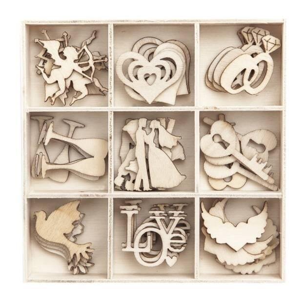 Fantastyczny zestaw kształtów z drewna a'la chipboard to idealny zestaw dla projektów ślubnychW drewnianej skrzyneczce znajduje się 45 aplikacji, w tym 9 różnych wzorów.Niektóre wzory posiadają dziurkę, przez którą można przewlec np. lniane nici dpCraft i utworzyć urocze zawieszki.Pakowanie: 3 szt.