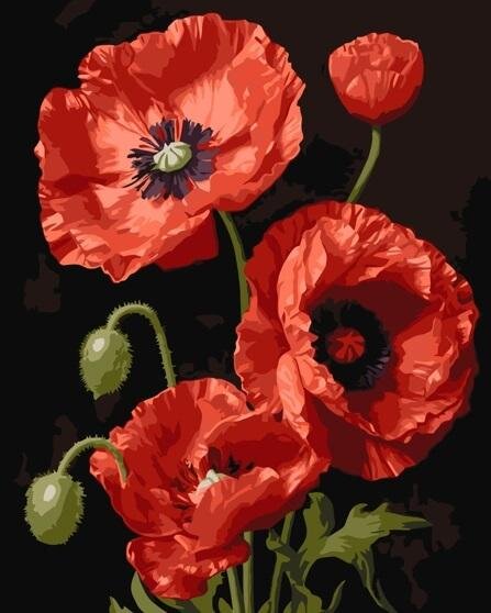 Zestaw do malowania po numerach "Czerwone maki" 40x50 cmZestaw do malowania numerycznego składa się z zagruntowanego płótna artystycznego na blejtramie, zestawu wysokiej jakości farb akrylowych odpornych na ścieranie i przypalanie o pojemności 2,5 ml 9% każda, nylonowych pędzli różnej wielkości,...