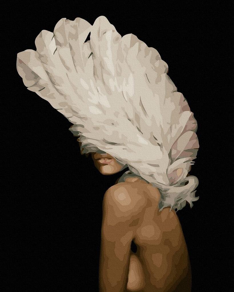 Tajemniczy akt kobiecy z wielkimi, białymi skrzydłami zakrywającymi twarz. Obraz łączy delikatność z odwagą i subtelną zmysłowością.Poziom trudności: średniWymiary: 40x50 cmZawiera: płótno na ramie, ponumerowane farby akrylowe, zestaw pędzli prečítať celé