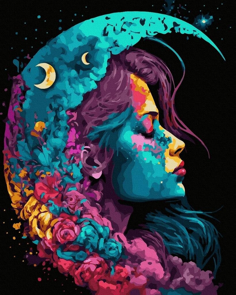 Ta hipnotyzująca kompozycja przedstawia profil kobiety otulonej księżycem i kosmiczną mgławicą, splecioną z barwnych róż. Jej spojrzenie skierowane ku gwiazdom symbolizuje marzenia, intuicję i wewnętrzną siłę. Idealna propozycja dla miłośników sztuki z nutą magii i tajemnicy.Poziom trudności:...