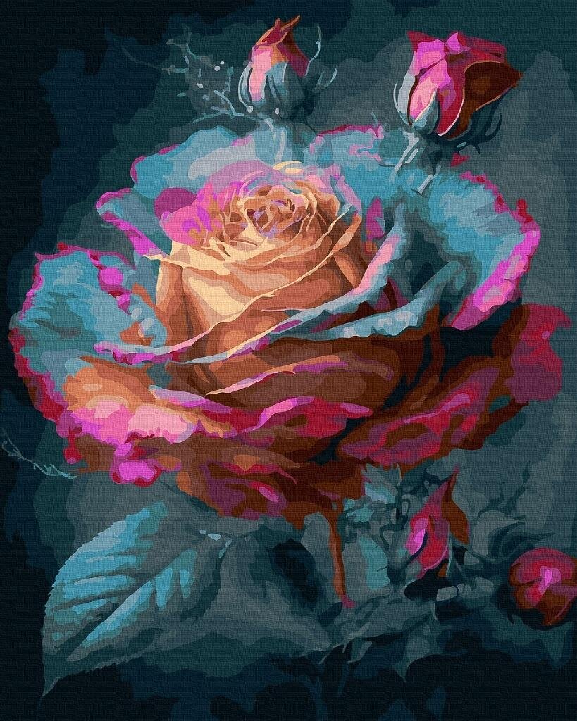 Romantyczna róża w niezwykłej kolorystyce róż, złoto i turkus. Elegancka dekoracja i relaksująca przyjemność malowania.Poziom trudności: średni.Wymiary: 40x50 cm.Zawiera: płótno na ramie, ponumerowane farby akrylowe, zestaw pędzli. prečítať celé