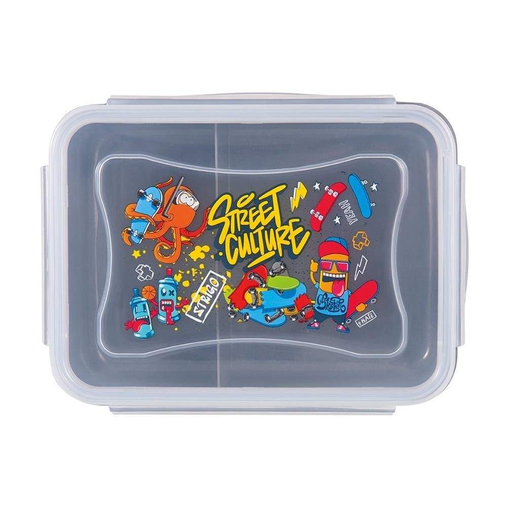 Lunch box z 2 przegródkami, o niepowtarzalnym wzorze. Możesz skompletować je z modelem plecaka CUBE 20015ST, piórnikiem, bidonem i workiem! Idealny dla dzieci, lubiących różnorodne posiłki. Estetyczny wygląd sprawi, że Twoje dziecko chętnie zabierze go ze sobą do szkoły oraz na wycieczkę. Wykonany z tworzywa plastikowego, zamykany na zatrzaski, posiadający silikonowe zabezpieczenia na brzegach. Wymiary: 16,5 cm x 12 cm x 6,5 cm.