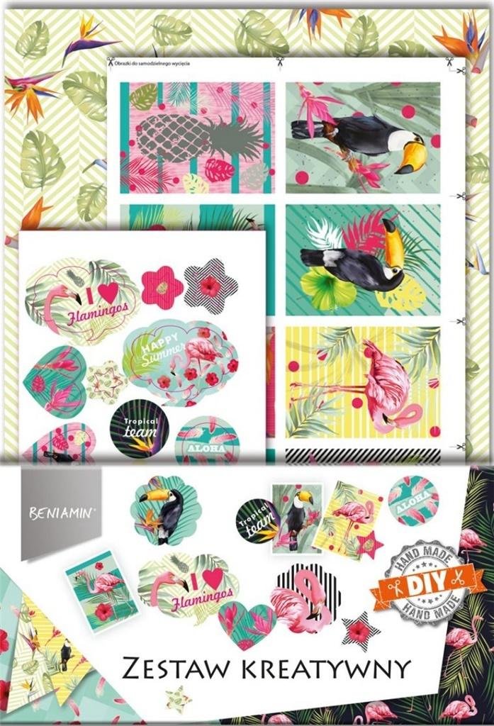 Zestaw kreatywny Flaming zawiera: - 4x A4 papier ozdobny (karton), - 4x A4 papier ozdobny, - 8 obrazków, - 52 naklejki, - 1x A4 papier samoprzylepny (złoty),- 1x A4 papier samoprzylepny (srebrny),- 1x A4 kalka kreślarska,- 1x A4 papier szary, prążkowany,- 1x A5 szablon z wyciętymi wzorami.