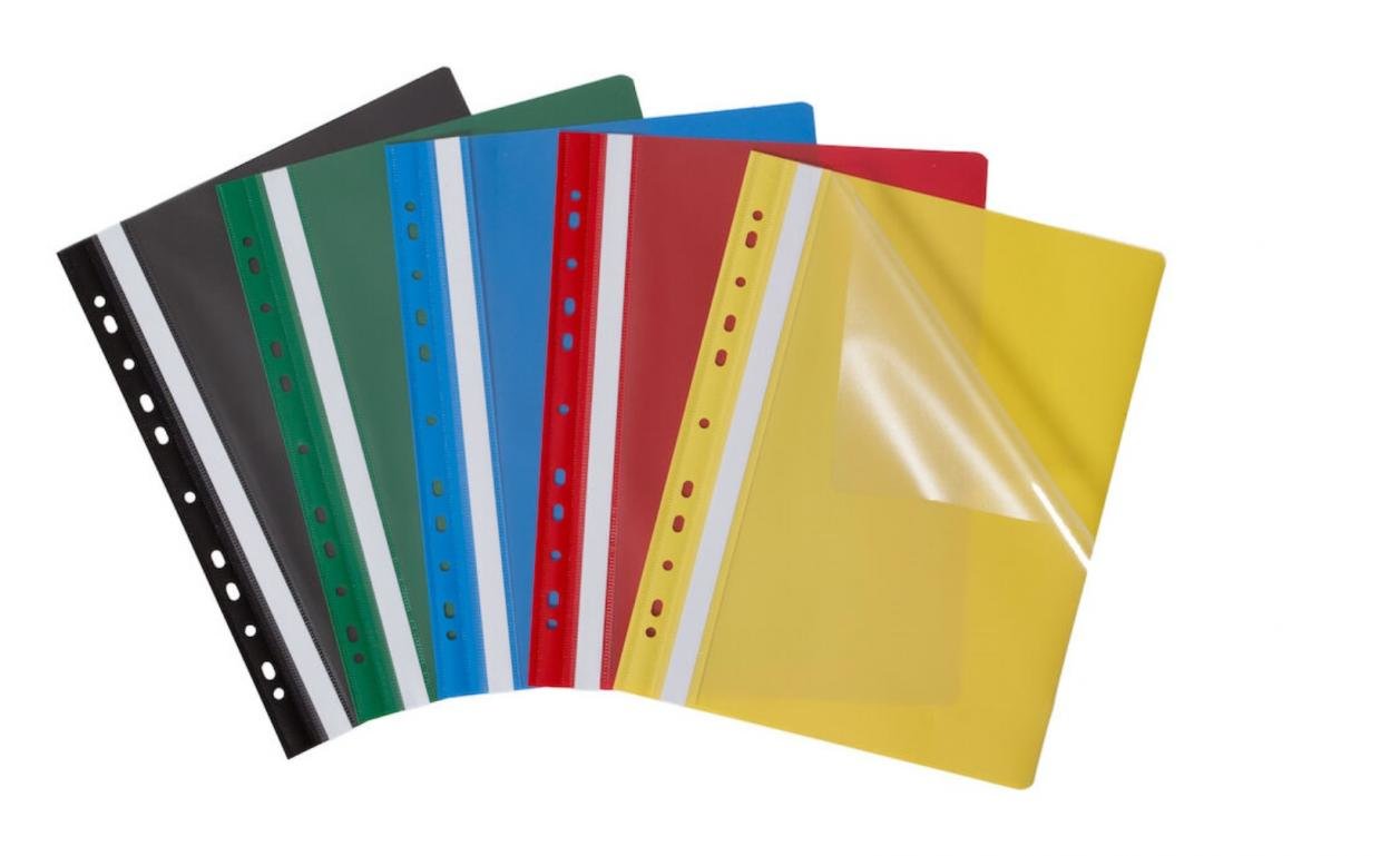 Opakowanie zbiorcze 25 szt. Skoroszyt w kolorze białym. o Wykonane z folii PPo Przezroczysta przednia okładka, kolorowa tylnao Na grzbiecie wymienny, papierowy pasek do opisuo Zaokrąglone rogio Metalowe wąsyo Standardowa perforacja na grzbiecie do wpięcia w segregatoro Format: A4