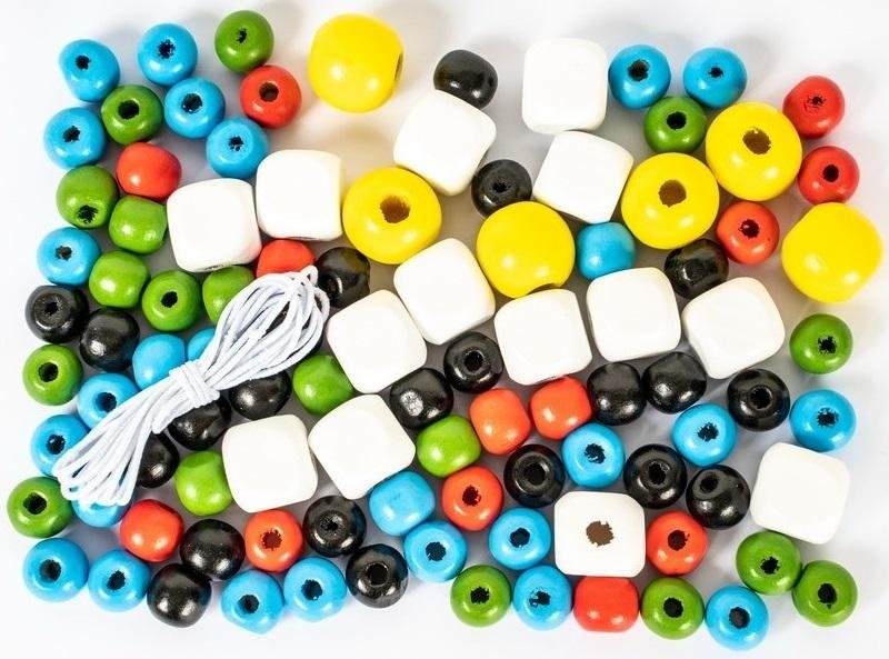 Koraliki drewniane w różnych kolorach, rozmiar koralików 10 - 15 mm, w opakowaniu 100 szt. + gumka biała 1 m prečítať celé