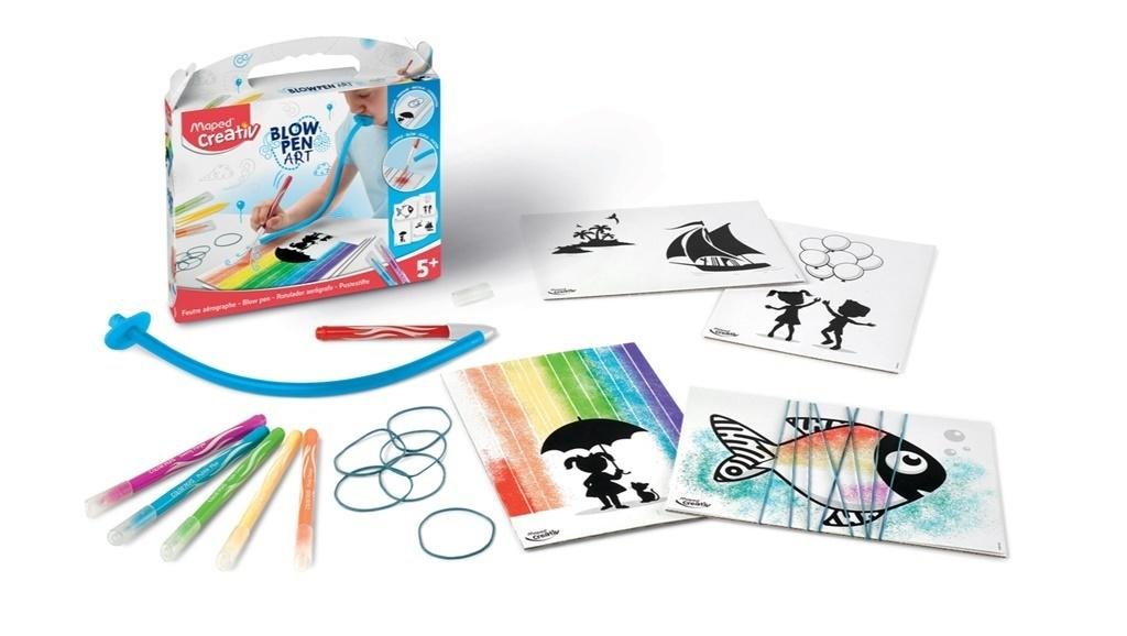 Nietypowy sposób na kolorowanie umieść flamaster w plastikowej nasadce z elastyczną rurką i dmuchaj w ustnik a kolorowa mgiełka osiądzie na kartce dając ciekawy efekt. W ogóle się nie zmęczysz dzięki rurce nie musisz się schylać nad swoim arcydziełem. Mamy dla Ciebie extra pomysł na ciekawy efekt...