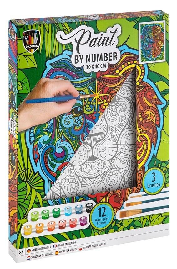 W zestawie znajduje się płótno z nadrukiem lwa o wymiarach 30 x 40 cm, na którym są numerki. 12 farbek, które mają przypisane numerki, dzięki, którym łatwiej będzie pomalować obraz. 3 pędzelki różnej grubości. Podczas malowania trzeba pamiętać, by dobrze wypłukać pędzel przed zamoczeniem w nowym kolorze. Malowanie po numerkach przeznaczone jest dla dzieci powyżej 8 roku życia.