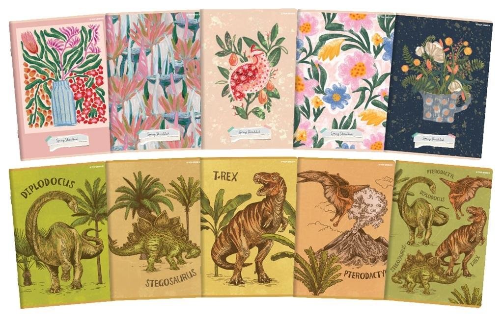 Matowa folia i wybiórczy lakier wypukły nadają okładkom elegancji. Zadrukowane okładki wewnętrzne doskonale korespondują z ilustracjami na przednich okładkach. Grzbiet zszywany zszywkami zapewnia trwałość zeszytów i wygodę pisania. Papier o grubości 70 g.