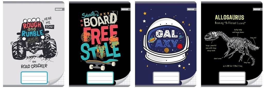 Zeszyt A5, posiada 16 kartek o gramaturze 70 g/m2 w kratkę. Charakteryzuje się estetycznym, lakierowanym wykończeniem i okładką idealną dla chłopca. Na zewnętrznej stronie okładki: imiennik - miejsce na wpisanie imienia, nazwiska, klasy.