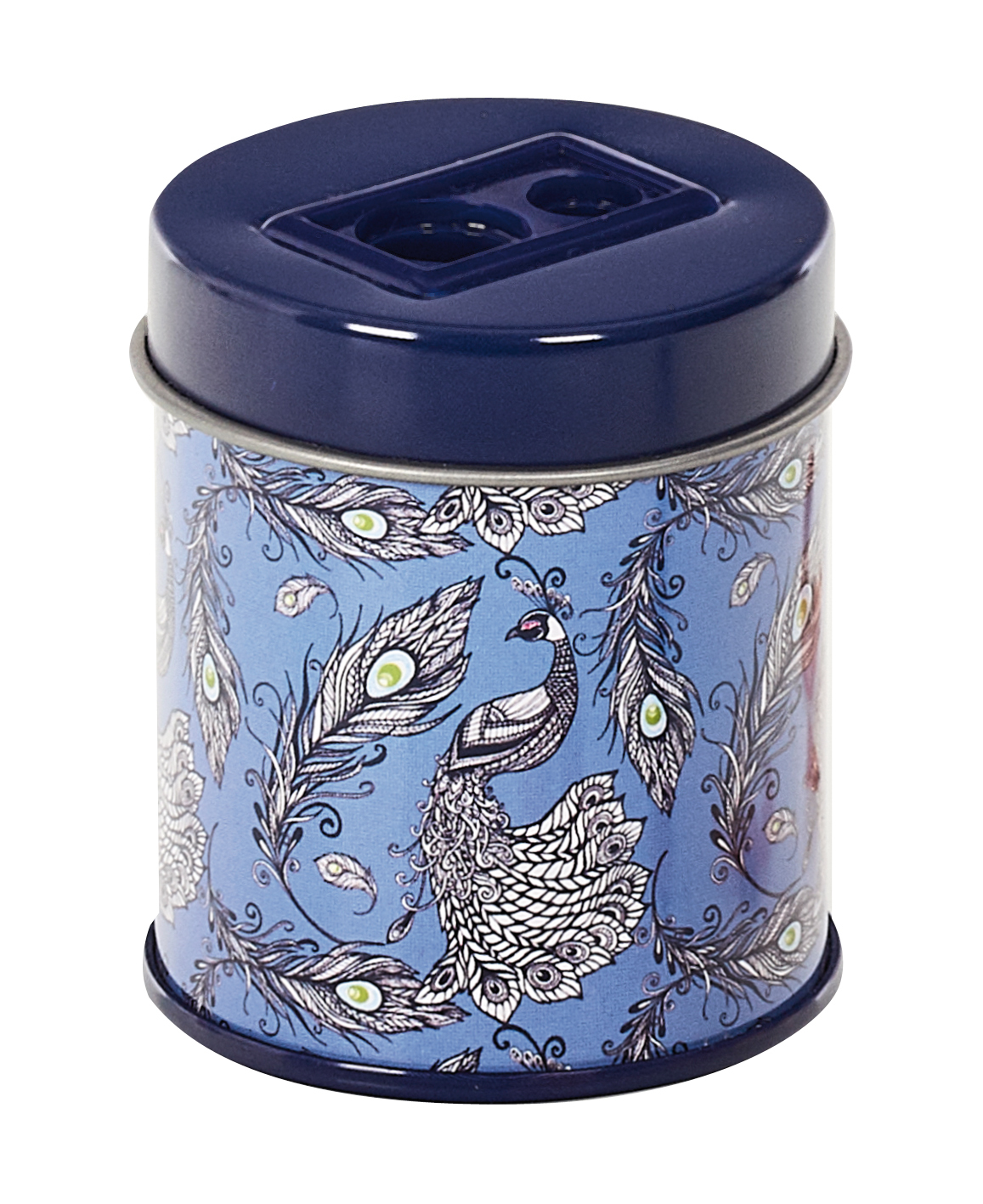 Dvojité ořezávátko na menší a větší tužky s motivem pávů v modro bílé barvě.Rozměry: 5 x 5 cm   Cedon prečítať celé