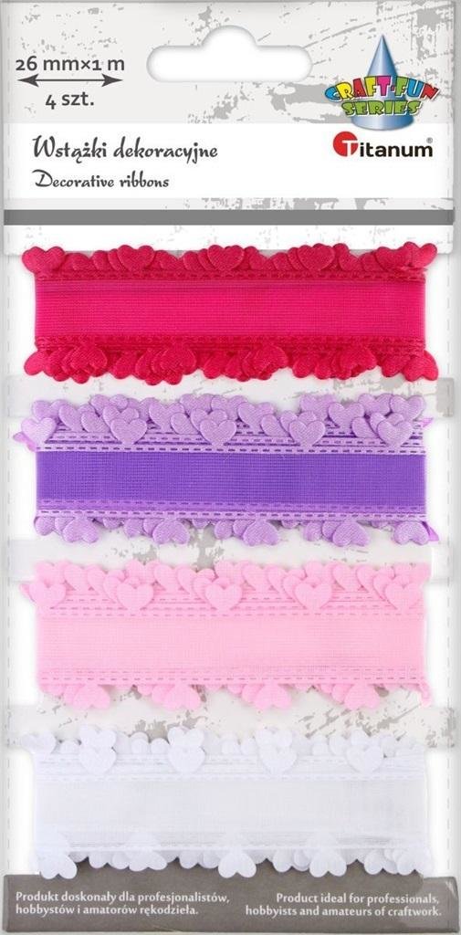 Wstążki z organzy 15mm, z falbanką z sercami 26mm, 4 kolory x1mkolory: fuksjowy, wrzosowy, jasnoróżowy, biały prečítať celé
