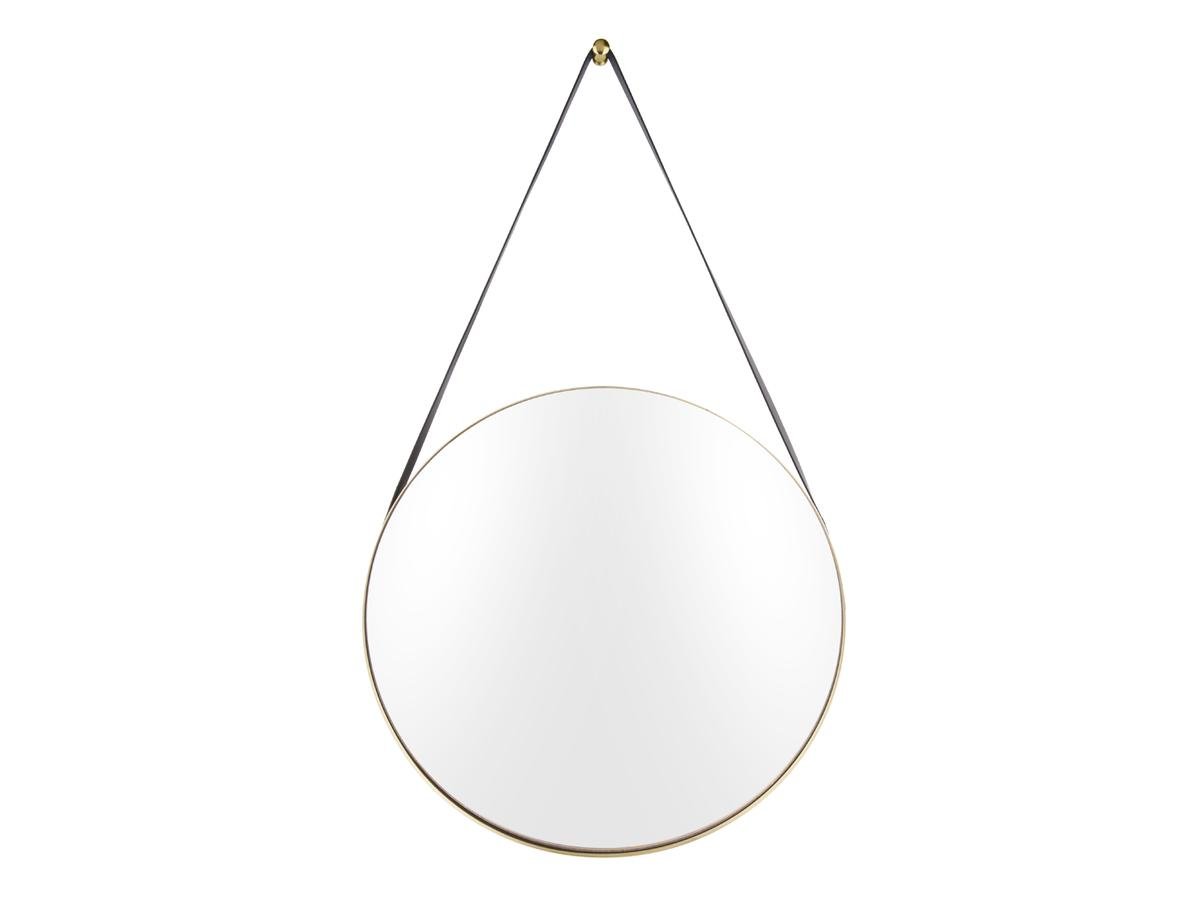 Kulaté zrcadlo se zlatým rámem, s černým koženým řemínkem a kovovým hákem.
