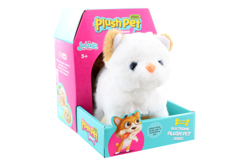 Chodící kočka na baterie. Po zapnutí kočka chodí, hýbe hlavou a ocáskem a vydává zvuky. Napájení na 2xAA baterie, které nejsou součástí balení. Materiál plast+plyš. Baleno v otevřené krabici ve tvaru boudičky. Součástí balení je plastová rybí kostra. Rozměry kočky 22x14x9 cm (měřeno s ocáskem). Rozměry balení cca 18,5x18,5x13,5 cm. Věk 3+
