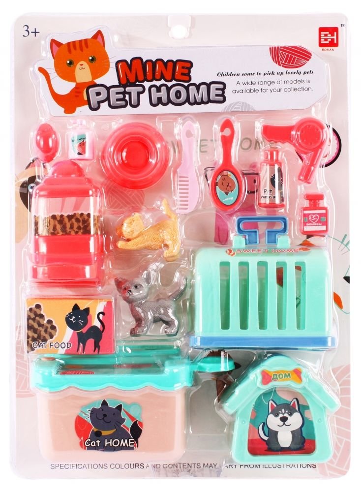 Obsah sady: transportér, 1 x pes figurka, 1 x kočičky figurka, miska pro Jídlo, domeček pro domácí mazlíčky, jídlo, doplňky pro péči o domácí zvířata. Rozměry [cm]: 21x29x8. Potřebné baterie. Hračka je určena pro děti ve věku na 3 roky. prečítať celé