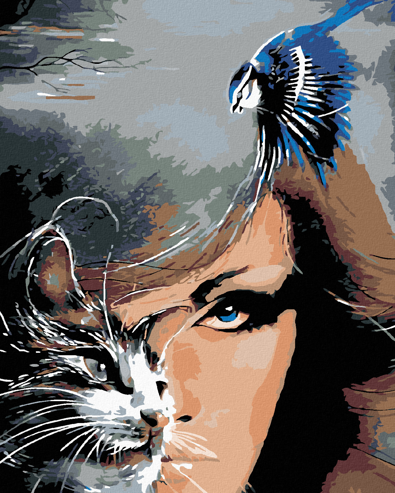 Malování podle čísel - ŽENA KOČKA A MODRÝ PTÁČEK - 80x100 cm, vypnuté plátno na rám