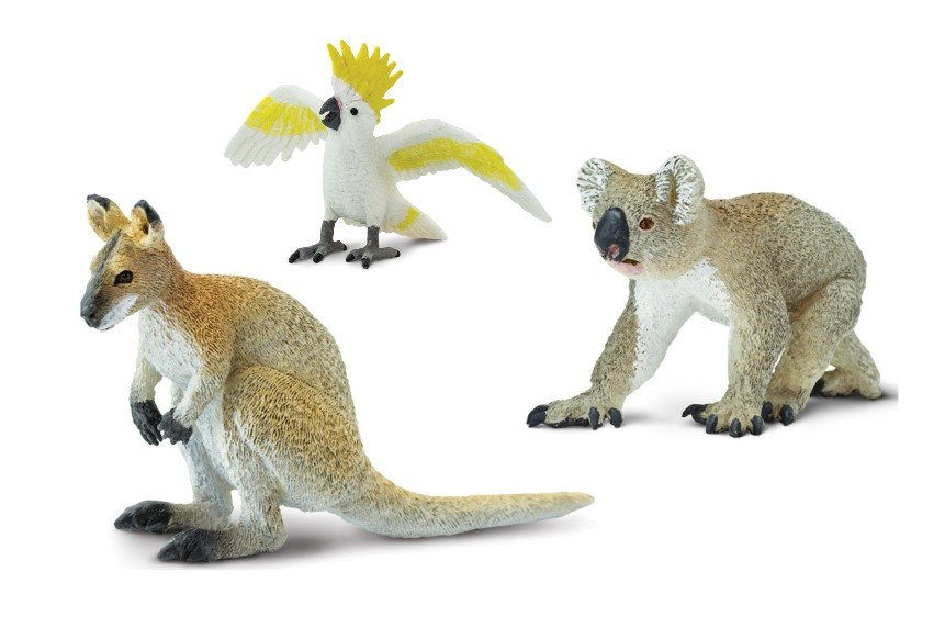 Balíček zvířat Austrálie od firmy Safari Ltd., v kterém najdete klokana, koalu a kakadu. Klokan (Wallaby) (SFS224929): 9 x 3 x 5 cm. Klokani mají dlouhou a úzkou lebku, většinou protáhlý čenich a hlavu, která vypadá drobná vzhledem k velikosti zbývajícího těla. Jejich vzrůst je střední až velký....