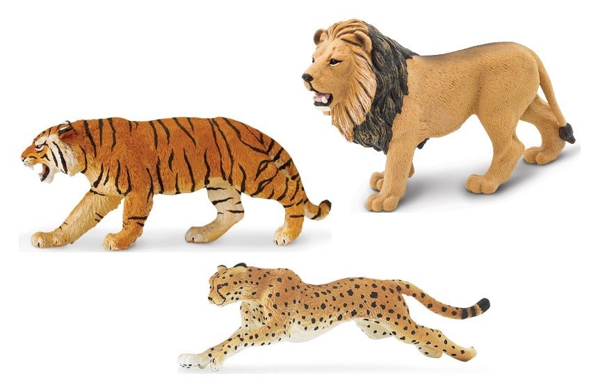 Balíček Kočkovité šelmy od firmy Safari Ltd., v kterém najdete tygra, lva a geparda. Tygr bengálský (SFS270829): 15 cm x 4 cm x 5,7 cm. Tygr je samotářské zvíře. Má své zavedené území, kde žije. Pruhování je méně husté než u ostatních tygrů, černé na žluto až oranžovohnědém podkladě. Lev...