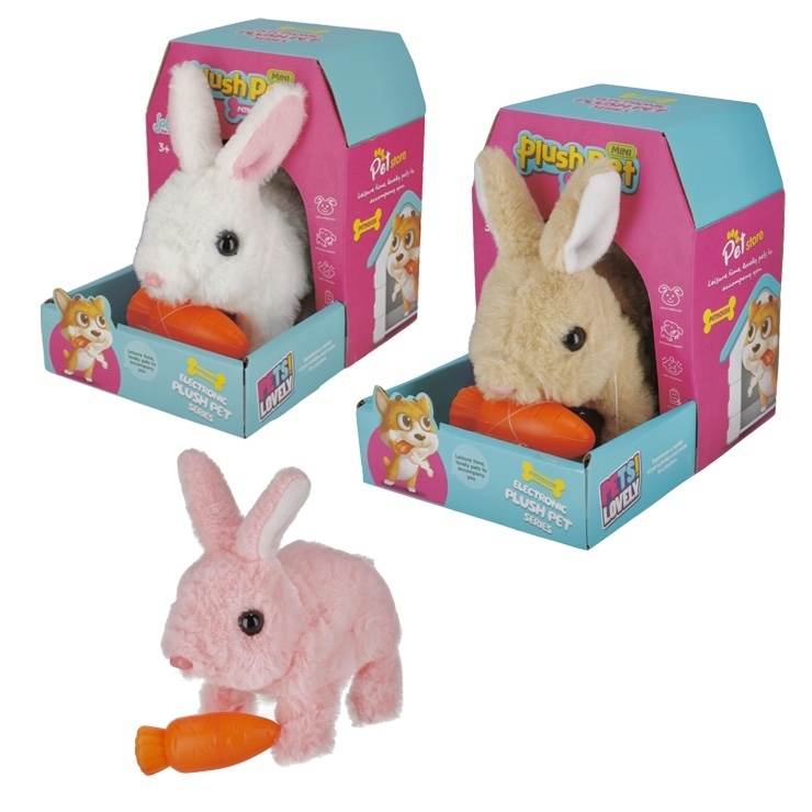 Králík je dostupný ve 3 barvách: bílá, růžová a hnědá. Je skvělým nápadem pro všechny děti, které milují zvířátka. Králík má zvukové a pohybové efekty: sladce vrže a poskakuje. Balení obsahuje interaktivního králíka, mrkev. Rozměry balení jsou 14x18x19cm. Vyžaduje 2 x AALR06 baterie – nejsou součástí sady. Určeno pro děti ve věku 3+.