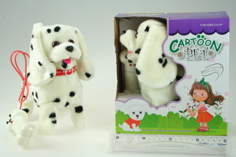 Pejsek na kabel o velikosti cca 18 cm X 23cm.Pejsek se ovládá ovladačm na kabel - stisknete-li levé tlačítko,pejsek půjde dozadu - stisknete-li pravé tlačítko,pejske půjde dopředu.Stisknete-li prostřední tlačítko,pejsek štěká.Provoz na 4 baterie AA do pejska a 2 baterie AA do ovladače.Věk 3+