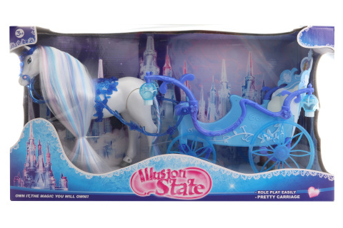 Koník s modrým kočárem. Po vložení baterií koník chodí, hraje a na kočáru svítí lucerničky. Napájení na 2 AA baterie (nejsou součástí balení). Rozměry balení cca 56 x 30 x 19 cm. Věk 3+ prečítať celé