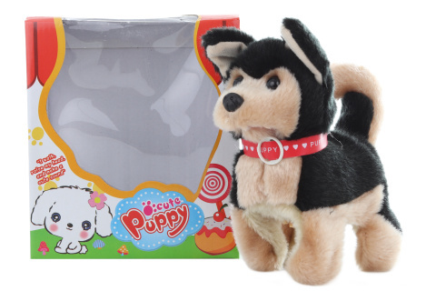 Pejsek chodící o velikosti cca 16 x 18 x 9 cm. Pejsek chodí a štěká. Napájení na 2 AA baterie (nejsou součástí). Rozměry balení cca 16 x 18 x 10 cm. Věk 3+ prečítať celé
