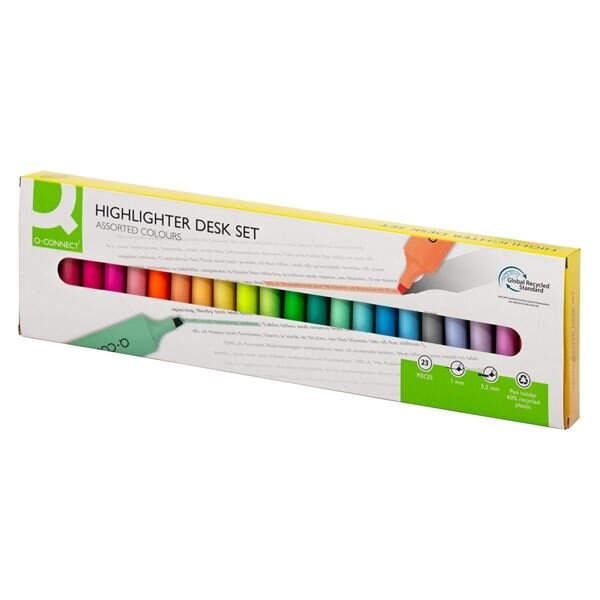 Stolní sada pastelových a neonových zvýrazňovačů Q-Connect;Vysoce kvalitní plastový držák na zvýrazňovače s 23 zvýrazňovači různých barev;Držák zvýrazňovačů 60% recyklovaný PP, zvýrazňovače 50% z recyklovaného PP;Rozměry držáku: 41,5 x 3,7 cm (d x š);Šíře stopy: 1,0 - 5,0 mm